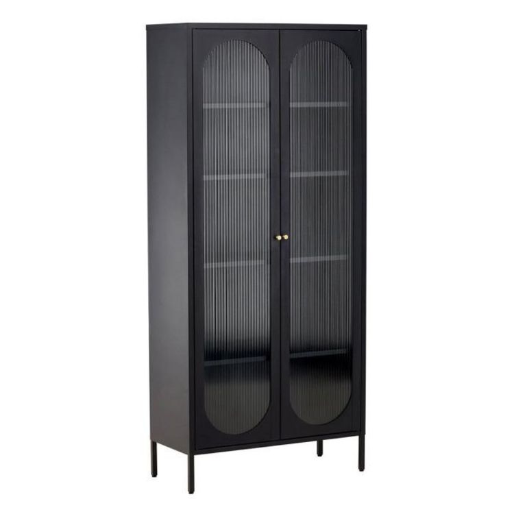 Informations Techniques : Dimensions : L. 80 x l. 35 x H. 180 cm Matières : Acier & Verre Spécificités : Élégante & Fonctionnelle Vitrine sur pied 2 portes en verre ondulé Nombre de colis : 1 Poids max supporté : 25 kg Poids : 42 kg Couleur : Noir
