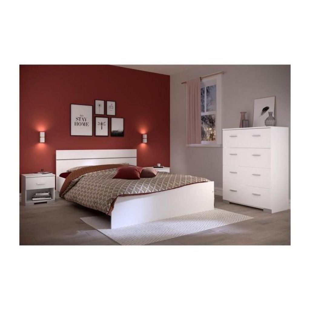Chambre complete BOSTON : Lit adulte 140x190 + Commode + 1 Chevet - Décor blanc - Fabriqué en France