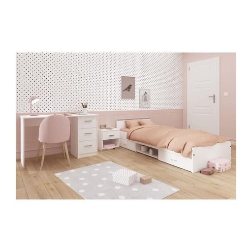 Le lit dispose de 2 tiroirs de rangement et d'une niche pratique pour maximiser l'organisation. Le chevet équipé d'un tiroir complète le système de stockage, tandis que le bureau offre une surface de travail ergonomique. Une solution intelligente pour garder la chambre ordonnée.