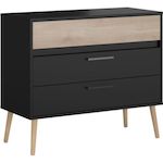 Craquez pour le design épuré et chaleureux de la commode AALBORG. Inspirée du style scandinave, elle marie avec élégance le noir profond et le chene naturel pour un rendu moderne et cosy. Ses trois tiroirs spacieux vous permettent de ranger facilement vos vetements, linge de maison ou objets du quotidien. Fabriquée en panneaux de particules de 15 mm d'épaisseur et revetue d'un papier décor de qualité, elle repose sur des pieds en bois vernis naturel qui assurent stabilité et durabilité. Dimensions : L90,8 x P39,9 x H77,5 cm. Un meuble fonctionnel et stylé qui apportera du cachet a votre intérieur.