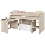 Le lit combiné enfant Parisot ZOLA est un meuble pratique et fonctionnel pour la chambre de votre enfant. Il est équipé d'un bureau sur roulettes et d'un rangement a 2 portes. La structure est en panneaux de particules avec un revetement papier décor acacia clair et blanc. Le bureau n'est pas révers