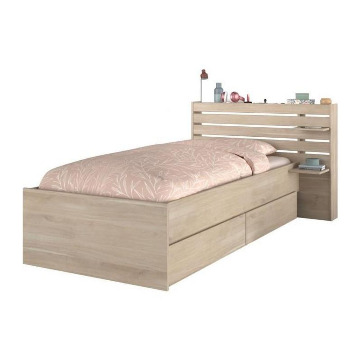 - Fonctionnalités de rangement : Équipé d'une tête de lit et de deux tiroirs pour un stockage pratique.