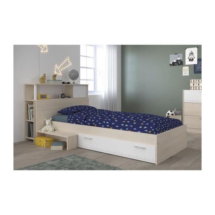 PARISOT Ensemble lit + tete de lit avec rangement - Style contemporain - Decor acacia clair et blanc - CHARLEMAGNE