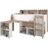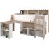 THEO Lit combiné enfant avec bureau rétractable sur roulettes et multiples rangements - Structure en panneaux de particules - Revetement papier décor chene et blanc - Couchage 90x200 - Sommier panneau inclus - Livré sans matelas - Dimensions totales avec bureau ouvert : L208 x H140 x P234 cm - Le couchage en hauteur ne convient pas a des enfants de moins de 6 ans