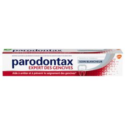 "NOUVEAU ! Dentifrice Parodontax Soin Blancheur - aide à arrêter et prévenir le saignement occasionnel des gencives pour des gencives saines et des dents fortes au quotidien. Vous saignez lors du brossage ou lorsque vous passez le fil dentaire ? Des gencives saines ne saignent pas. Cela peut être un signe d'une inflammation des gencives qui non traitée peut se développer et conduire à une mauvaise haleine, des gencives rouges et gonflées, une récession gingivale et enfin au déchaussement des dents. Le dentifrice Parodontax est spécialement formulé pour aider à éliminer les causes du saignement occasionnel des gencives : un usage au quotidien aide à éliminer efficacement les bactéries de la plaque dentaire pour des gencives saines, des dents fortes et une haleine fraîche. La formule unique du dentifrice Parodontax lui confère un goût particulier qui peut prendre entre 5 et 15 jours pour être appréciée. Le dentifrice Parodontax Soin Blancheur aide également à restaurer la blancheur naturelle des dents en éliminant en douceur les tâches en surface."