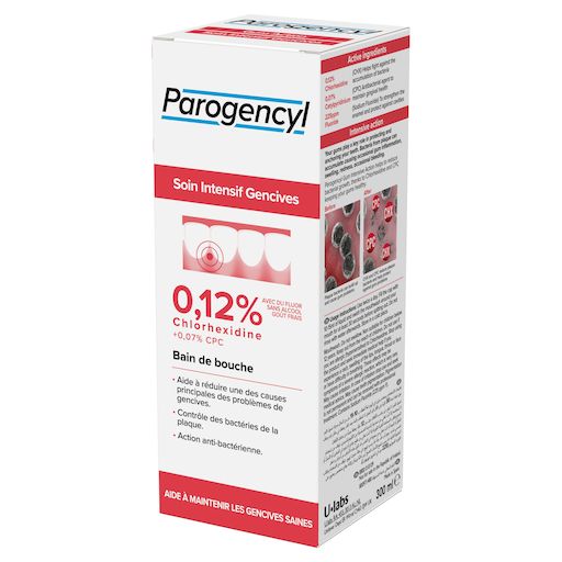 Le bain de bouche Parogencyl Soin Intensif Gencives aide à réduire significativement la croissance des bactéries sur la plaque grace à la Chlorhexidine et aide à maintenir les gencives saines grâce au CPC. Vos gencives jouent un rôle essentiel dans la protection et l'ancrage de vos dents. Les bactéries de la plaque dentaire peuvent s'accumuler et provoquer des inflammations occasionnelles : gonflements, rougeurs et saignements occasionnels des gencives. Ingrédients actifs : 0,12% de CHX (Chlorhexidine Digluconate) - L'ingrédient de référence, qui aide à réduire l'accumulation des bactéries et de la plaque dentaire. 0.07% de CPC (Chlorure de Cetylpyridinium) - Un agent antibactérien pour maintenir des gencives saines. 225ppm de Fluor (Fluorure de Sodium) - Pour renforcer l'émail et favoriser la prévention des caries.