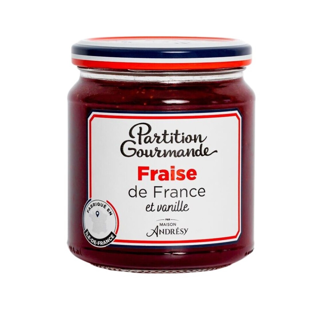 Ingrédients : Sucre de betterave, Fraises de Dordogne, gélifiant : pectines, acidifiant : acide citrique, extrait de vanille
