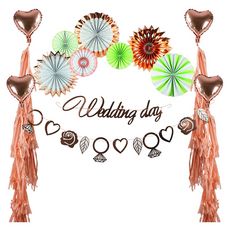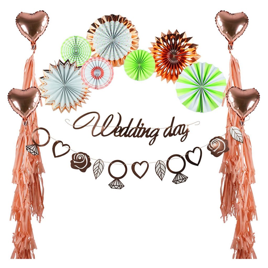 Party box décorations mariage comprenant : 2 guirlandes D'1M85 7 éventails à accrocher (3x17cm de diamètre, 2x28cm de diamètre, 2x30cm de diamètre) 4 ballons alu coeur 25 cm