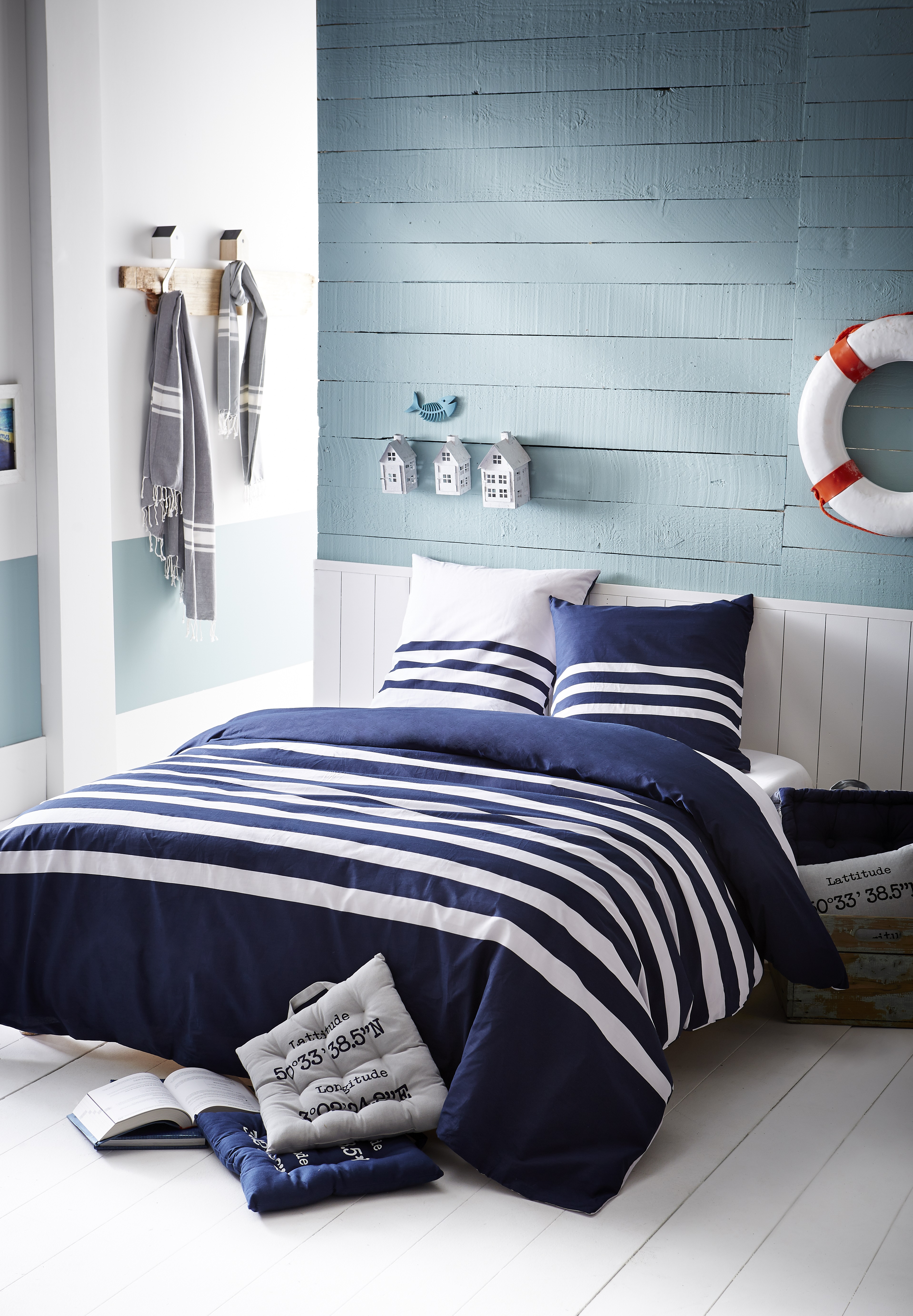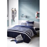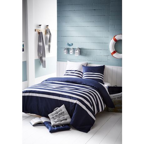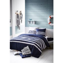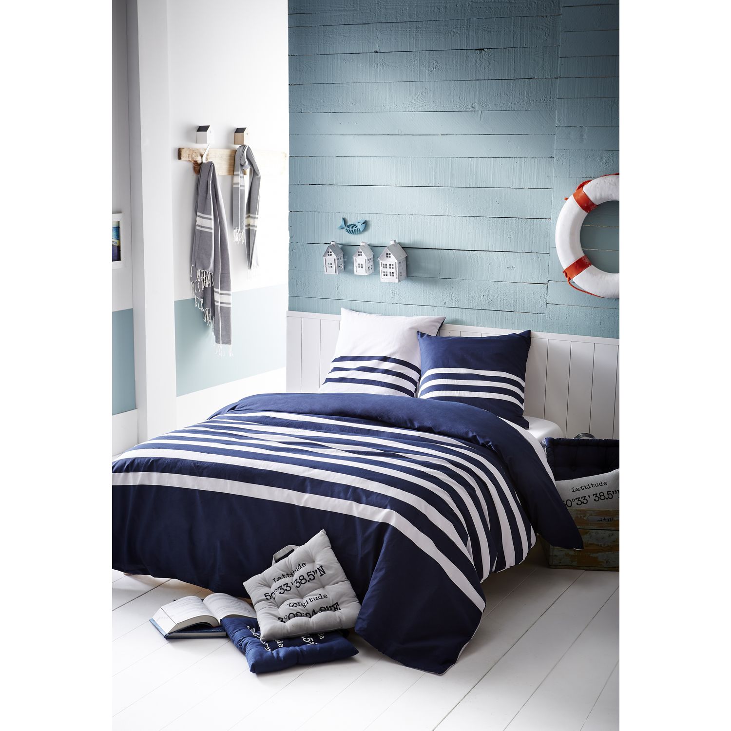 Parure housse de couette + taies d'oreiller en toile pur coton tissée bien serré, confortable et douce au toucher. Après la mode, l'esprit "marinière" s'invite dans la chambre. Rayures toniques, association intemporelle du marine et du blanc, un air de vacances flotte sur le lit. On adore ! La houss