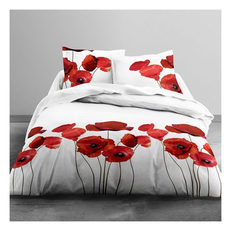 En savoir +Parure housse de couette + 2 taies d'oreiller en toile pur coton tissée bien serré, confortable et douce au toucher. Parsemé de coquelicots géants "plus vrais que nature", un linge de lit aussi spectaculaire que charmant... comme une grande bouffée d'air pur dans la chambre. On aime... et on se laisse séduire, juste pour le plaisir.
