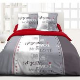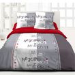 Parure housse de couette + taies d'oreiller en toile pur coton. Une bonne dose d'humour, un zeste de tendresse et beaucoup de modernité... un cocktail gagnant pour un linge de lit craquant ! A noter, le verso rouge uni de la housse de couette qui lui donne un joli coup de peps. Housse de couette à b