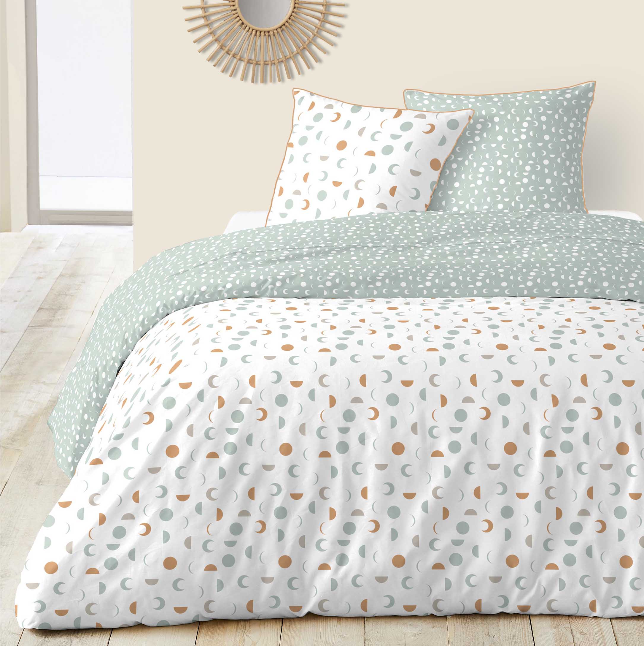 Parure housse de couette 1 ou 2 personne(s) + taie(s) d'oreiller en toile pur coton tissée bien serré, douce au toucher, confortable et résistante. Des croissants de lune comme s'il en pleuvait, colorés sur fond blanc ou blancs sur fond vert grisé... un linge de lit pur charme qui apporte un vent de douceur dans la chambre. Le petit plus ? la jolie finitions des taies d'oreiller par un piping uni contrastant. Housse de couette à rabat de pied.