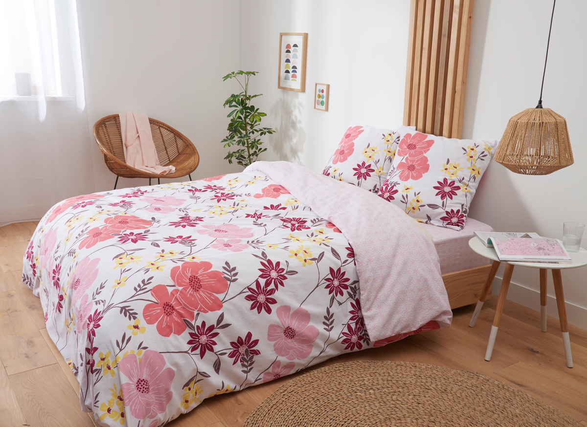 Parure housse de couette + taies d'oreiller en toile pur coton tissée bien serré, douce au toucher, confortable et résistante. Un motif floral aux tons raffinés qui se détache sur un fond blanc immaculé, un linge de lit ultra déco qui donne du style à la chambre. A noter, le délicat verso de la housse de couette, assorti au drap-housse... craquant ! Housse de couette à rabat de pied, pour rester toujours bien bordée.
