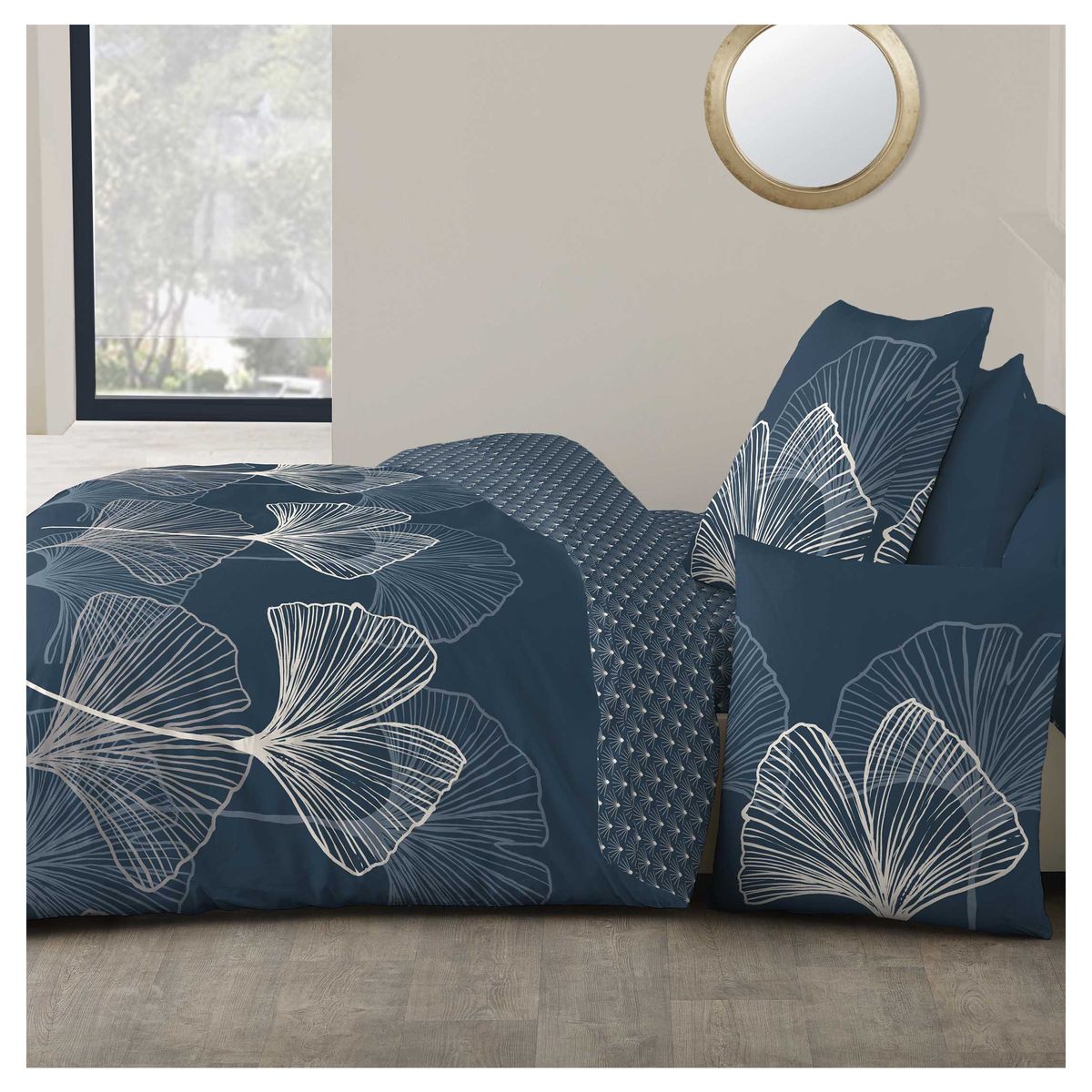 Parure housse de couette 1 ou 2 personne(s) + taie(s) d'oreiller en toile pur coton tissée bien serré, douce au toucher, confortable et résistante. Des feuilles géantes de ginkgo biloba dessinées tout en finesse, une harmonie de couleurs d'une sobriété élégante et très contemporaine, le charme du verso à petits motifs... un linge de lit résolument déco qui donne du style à la chambre. A s'offrir avec le drap-housse coordonné pour que le plaisir soit complet ! Housse de couette à rabat de pied.