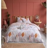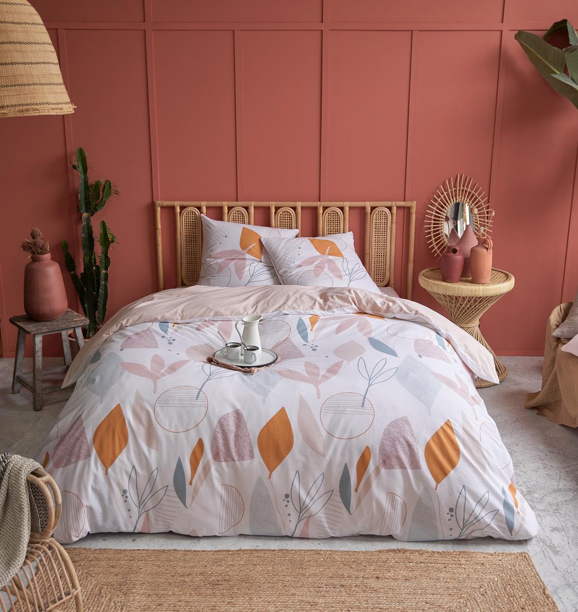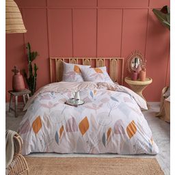 Parure housse de couette + taies d'oreiller en toile pur coton tissée bien serré, douce au toucher, confortable et résistante. Un motif à la fois graphique et végétal décliné dans une harmonie de tons reposante et raffinée... un linge de lit stylé qui se sent aussi bien dans une chambre contemporaine que dans une déco plus classique. A noter, la finition soignée des taies par un passepoil contrastant. Housse de couette à rabat de pied, drap-housse assorti vendu sur notre site.
