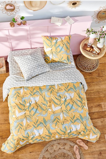 Parure housse de couette 1 ou 2 personne(s) + taie(s) d'oreiller en toile pur coton tissée très serré, très douce au toucher, confortable, résistante et labellisée OEKO TEX (garantie d'une fabrication sans aucun produit toxique pour l'homme et l'environnement). L'élégance d'un motif végétal finement dessiné, le coup d'éclat d'un lumineux fond jaune, le verso lui aussi très déco... un linge de lit qui cultive un raffinement tout en délicatesse. On craque ! Housse de couette à rabat de pied.