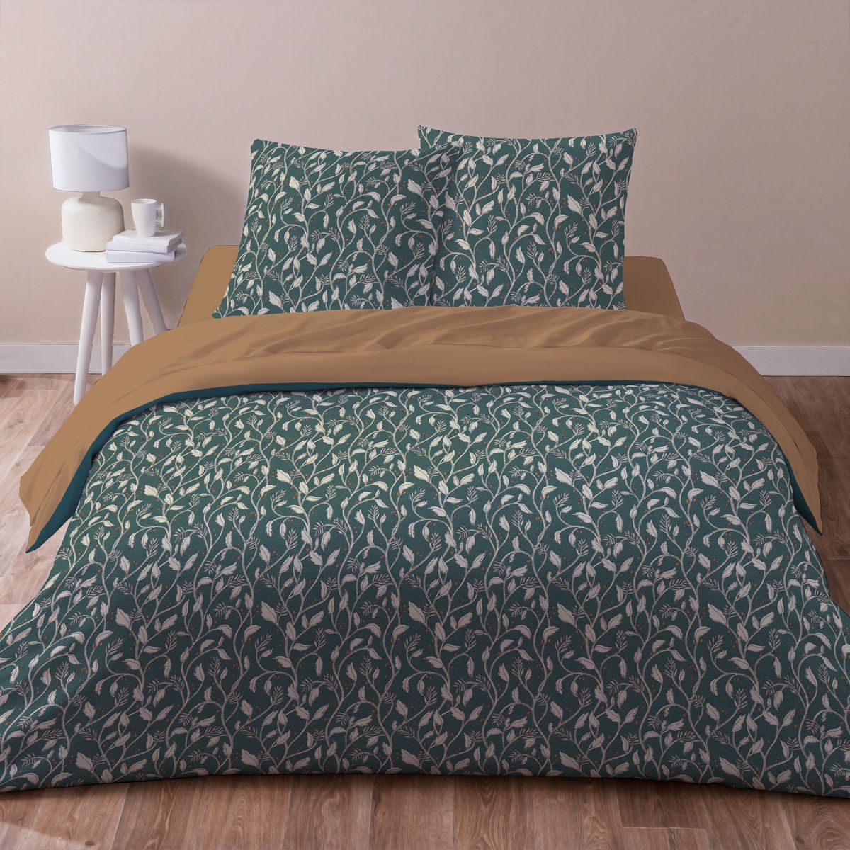 Parure housse de couette 1 ou 2 personne(s) + taie(s) d'oreiller en microfibre. Un motif végétal aussi actuel que déco, des tons profonds qui donnent du chic à la chambre... superbe ! Côté matière, une microfibre ultra douce, légère et respirante, tiède en hiver et fraîche en été, qui sèche en un clin d'oeil et ne se repasse pas. Un linge de lit de rêve, à compléter avec le drap-housse uni cooordonné pour que le plaisir soit complet. Housse de couette à base droite.