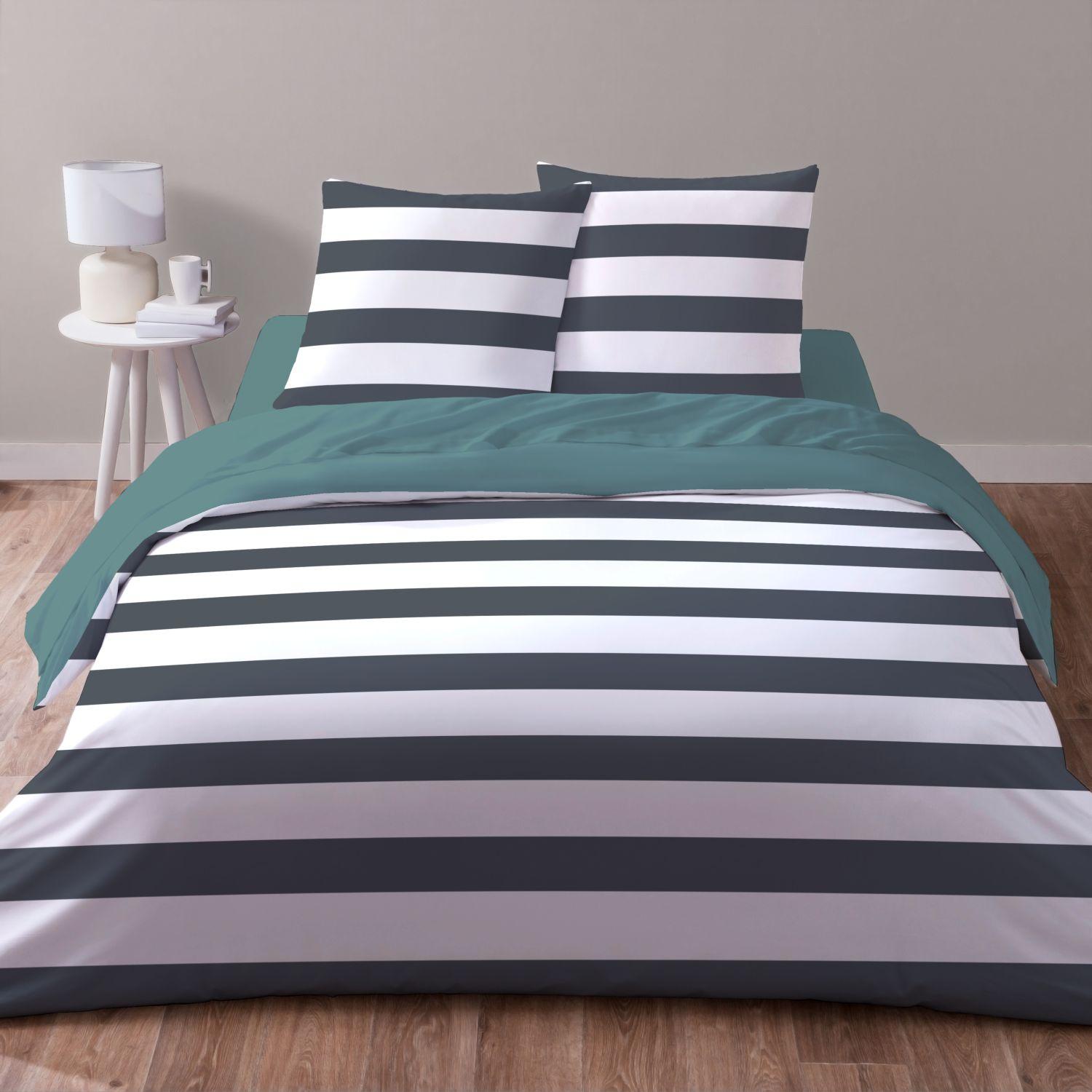 Parure housse de couette 1 ou 2 personne(s) + taie(s) d'oreiller en microfibre. Les rayures... on les aime depuis toujours et on ne s'en lasse pas ! A la fois chic et décontractées elle donnent un air de vacances à la chambre... on adore ! Côté matière, c'est une microfibre douce, légère, respirante et ultra confortable, qui sèche en un clin d'oeil et ne se repasse pas. Un linge de lit de rêve, à compléter avec le drap-housse uni coordonné pour un lit pur bonheur ! Housse de couette base droite.