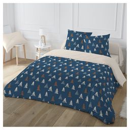 Parure housse de couette 1 ou 2 personne(s) + taie(s) d'oreiller en toile polyester/coton. Un adorable motif sapins sur fond bleu intense pour un linge de lit qui nous donne des envies d'hiver douillet ! Côté matière, c'est une toile douce au toucher qui sèche vite et ne demande qu'un léger repassage. On adore ! Housse de couette à base droite.