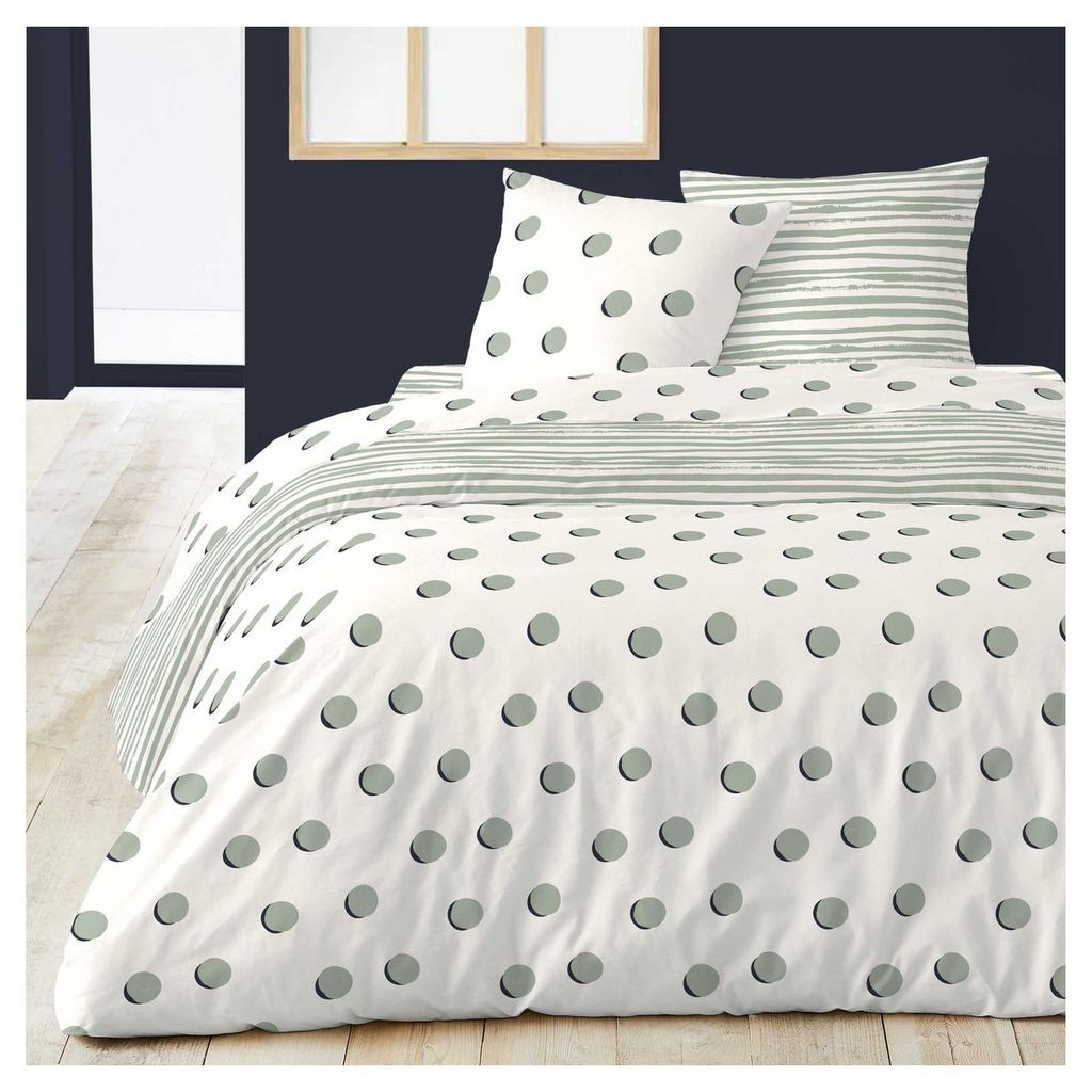 Parure housse de couette 1 ou 2 personne(s) + taie(s) d'oreiller en satin pur coton, une étoffe de grande qualité, souple, soyeuse et infiniment douce, réalisée avec des fils très fins tissés très serré. Une face à pois, l'autre rayée, le tout dans des tons doux et raffinés... 2 parures en 1 pour mixer les motifs au gré de ses envies ! A s'offrir avec le drap-housse rayé coordonné pour que le plaisir soit complet. Housse de couette à base droite boutonnée.