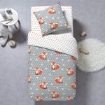Parure housse de couette enfant + 1 ou 2 taie(s) d'oreiller en toile pur coton. Une floppée de petits renards malicieux, des couleurs harmonieuses et un adorable verso à pois... un linge de lit qui a tout pour lui et qui fera le bonheur des petites têtes blondes ! Housse de couette à base droite. A noter, la dimension 200 x 200 convient parfaitement aux lits 1 personne : la couette retombe alors davantage sur les côtés pour un confort au top !