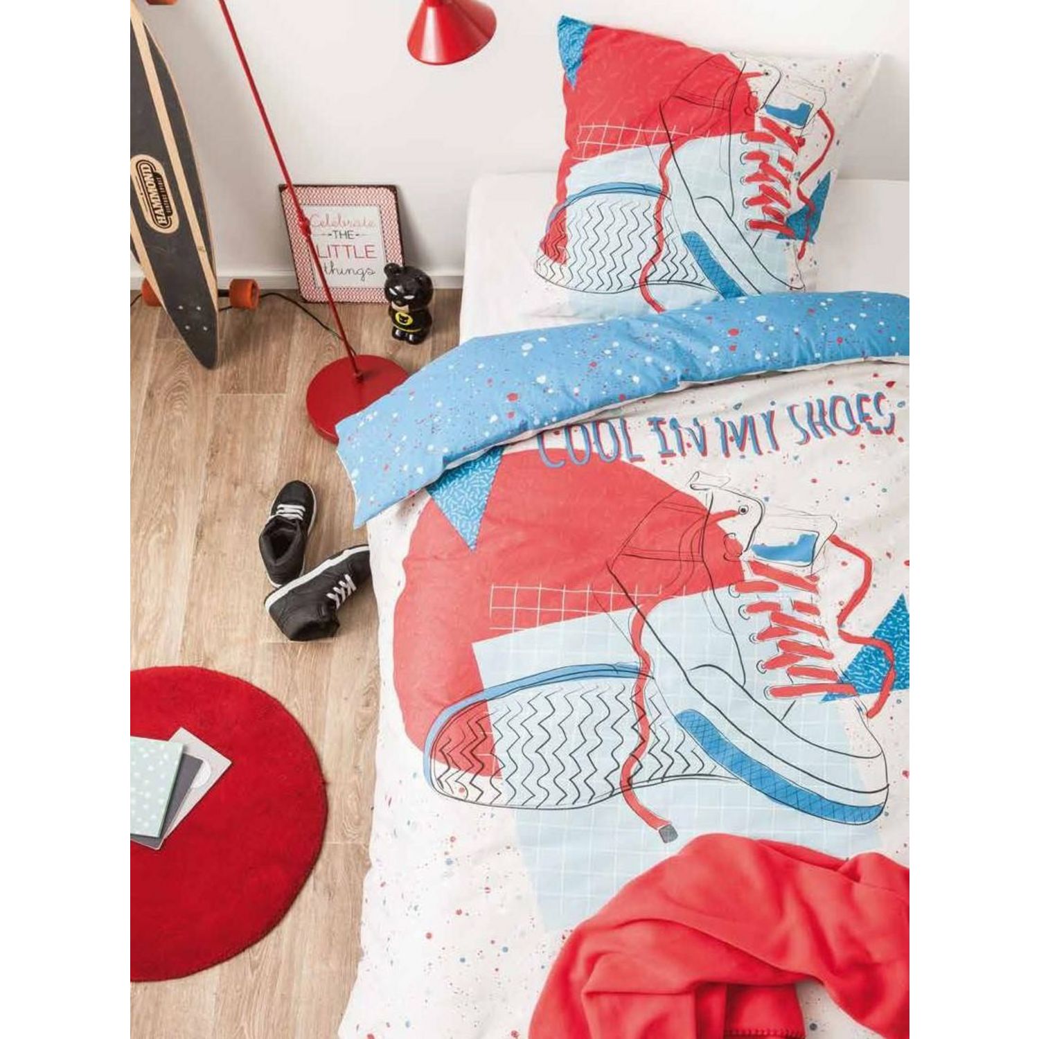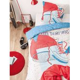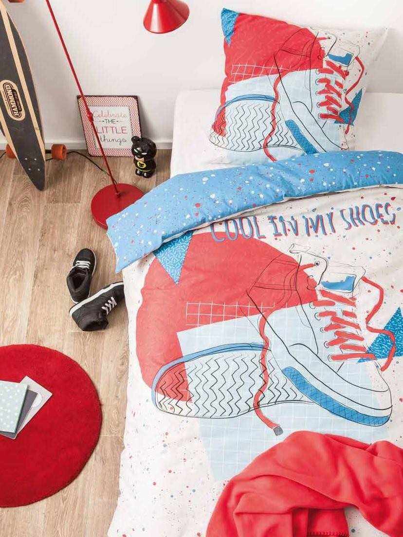 Parure housse de couette enfant + taie d'oreiller en toile pur coton. Des baskets géantes qui s'invitent sur le lit... c'est fun, original et joyeux ! On adore ! Une parure à offrir pour le plaisir de faire plaisir... Housse de couette réversible (le verso aussi est super sympa), à base droite.