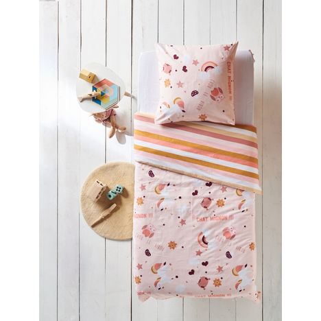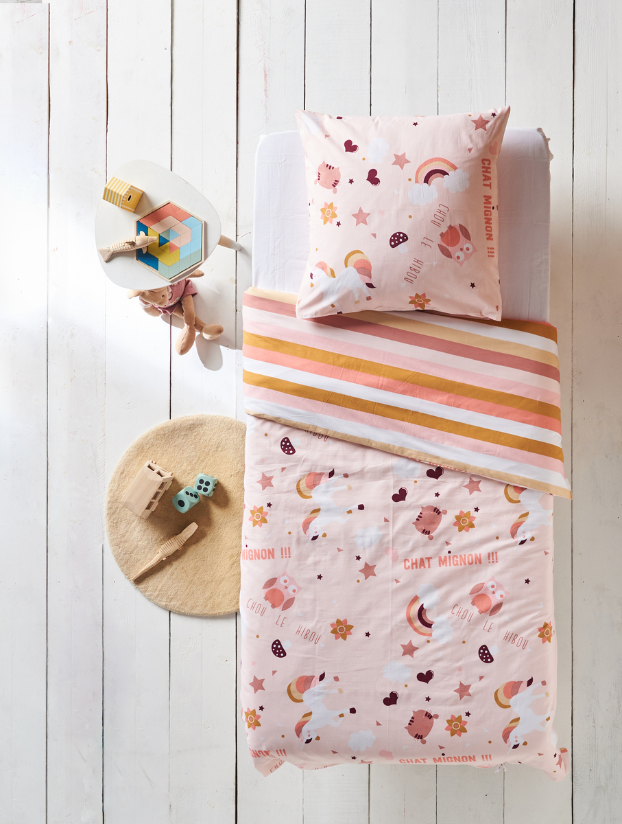 Parure housse de couette enfant en polycoton LICORNE aux inscriptions "Chou le hibou" et "chat mignon". Détails étoiles, cœur, fleurs et arc en ciel. Parure réversible. Le polycoton s'assouplit au fil des lavages.