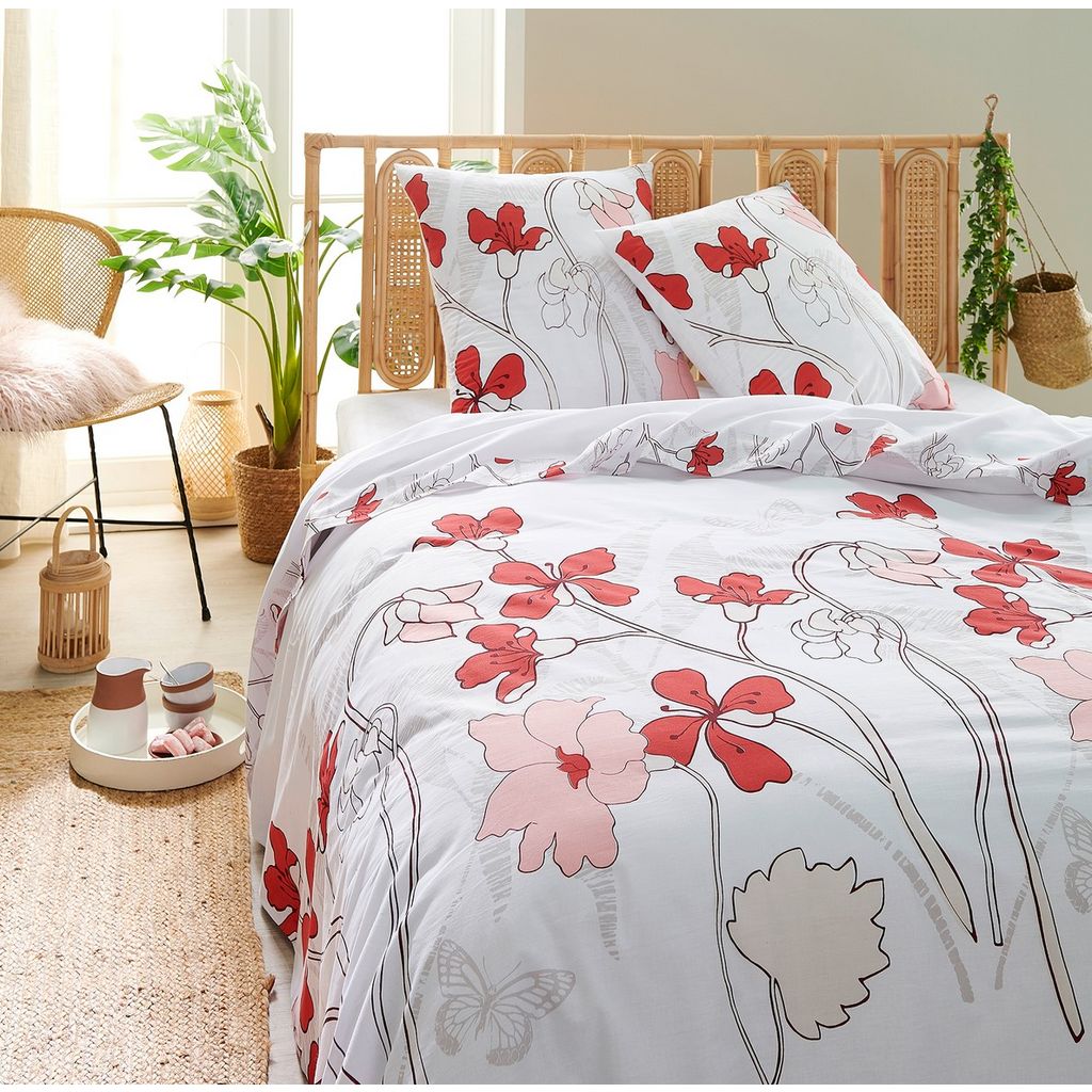 Parure housse de couette + taies d'oreiller en toile pur coton. Un motif floral délicat, des couleurs chaleureuses sur un blanc immaculé... un linge de lit raffiné pour une chambre paisible où il fait bon se ressourcer. On craque... et pour que le plaisir soit complet, on s'offre en même temps le drap-housse coordonné. Housse de couette à base droite.