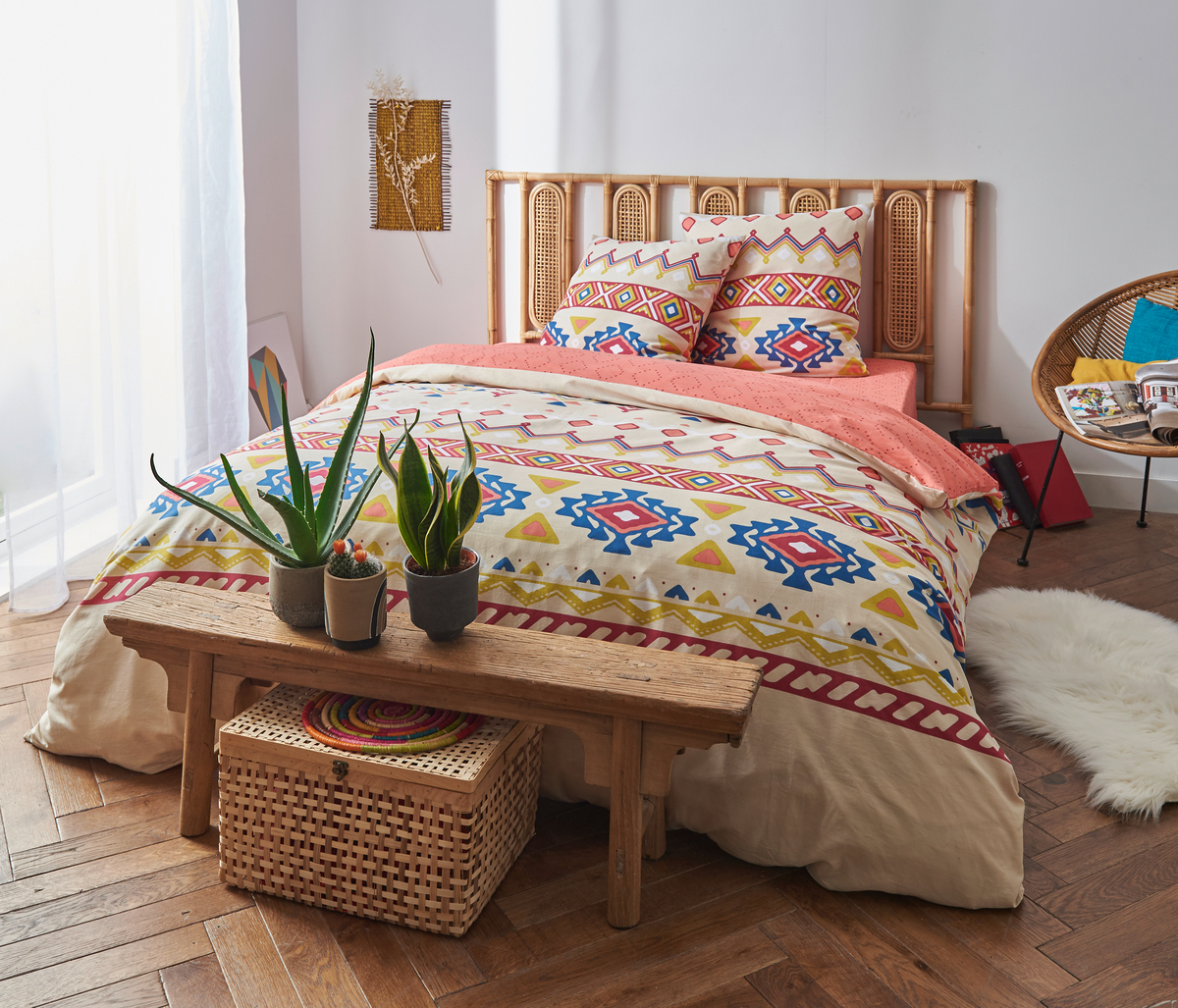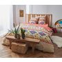 Parure housse de couette + taies d'oreiller en toile pur coton. Un superbe motif d'inspiration ethnique, des couleurs joyeuses en parfaite harmonie... un linge de lit qui donne une belle personnalité à la chambre. A noter, le verso d'un rose gourmand assorti au drap-housse... drap-housse que l'on s'offre sans hésiter pour compléter cette belle parure ! Housse de couette à base droite.