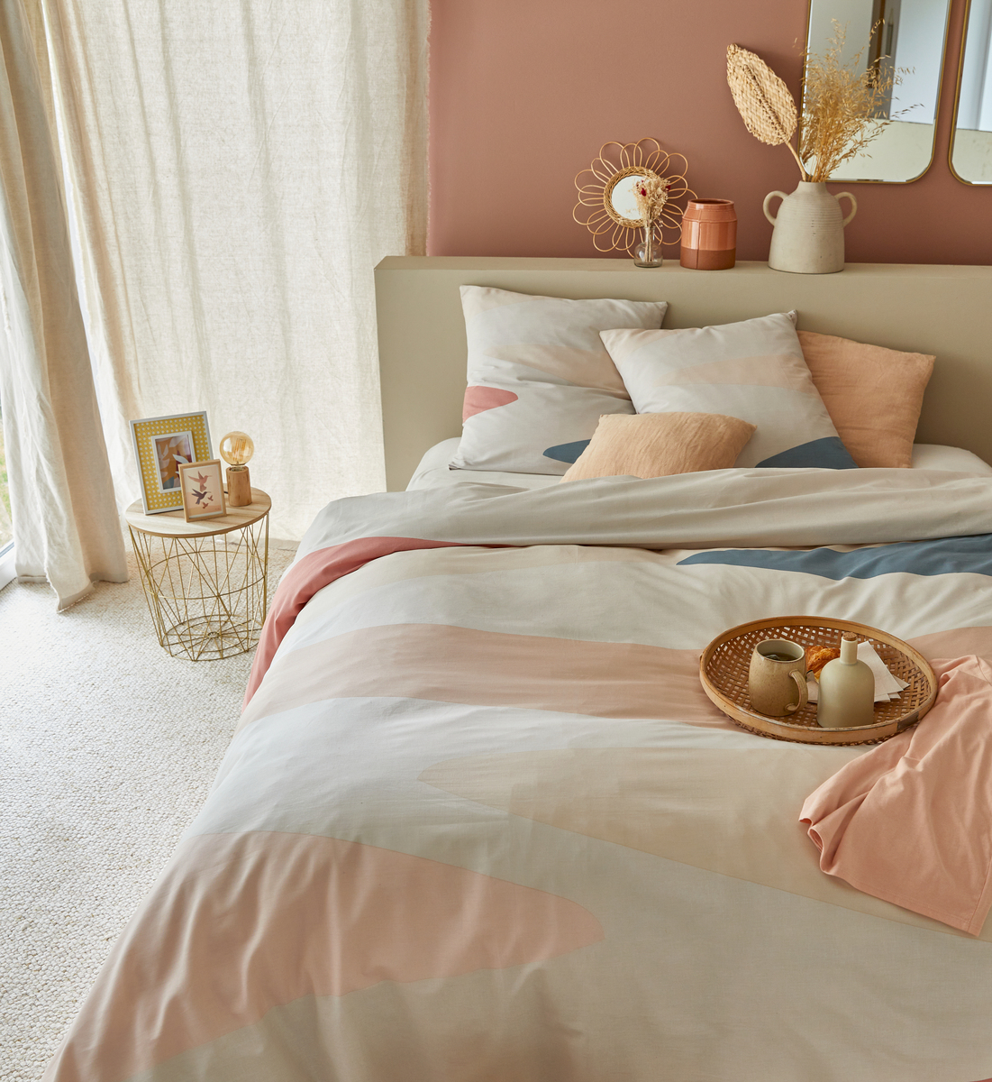 Parure housse de couette 1 ou 2 personne(s) + taie(s) d'oreiller en toile pur coton tissée bien serré, douce au toucher, confortable et résistante. Motif graphique sobre et chic, belle harmonie de couleurs raffinées, un linge de lit très contemporain qui apporte un vrai "plus déco" à la chambre. Housse de couette à rabat de pied, pour rester toujours bien bordée.
