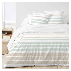 Parure housse de couette 1 ou 2 personne(s) + taie(s) d'oreiller en toile pur coton. Des rayures intemporelles recoloriées dans une harmonie pastel qui nous évoque le sable et la mer... un linge de lit rafraîchissant pour une chambre qui respire le calme et le bien-être. Housse de couette à rabat de pied pour rester toujours bien bordée.
