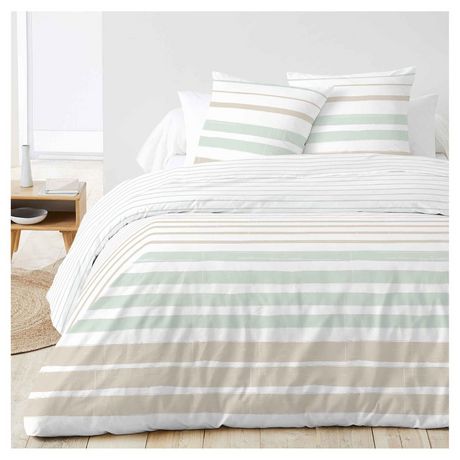 Parure housse de couette 1 ou 2 personne(s) + taie(s) d'oreiller en toile pur coton. Des rayures intemporelles recoloriées dans une harmonie pastel qui nous évoque le sable et la mer... un linge de lit rafraîchissant pour une chambre qui respire le calme et le bien-être. Housse de couette à rabat de