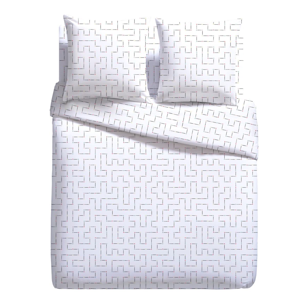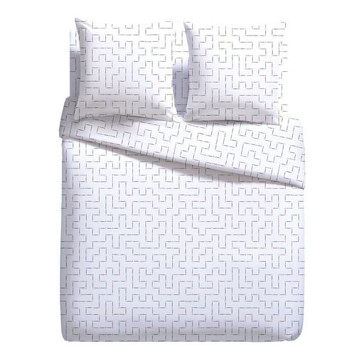 Parure housse de couette 1 ou 2 personne(s) + taie(s) d'oreiller en microfibre. Tout imprimé d'un motif labyrinthe à la fois graphique et ludique, c'est un linge de lit résolument contemporain qui donne du style à la chambre. Côté matière, une microfibre ultra douce et légère, respirante donc très confortable, qui sèche en un clin d'oeil et ne se repasse pas. Une parure de rêve ! Housse de couette à base droite.
