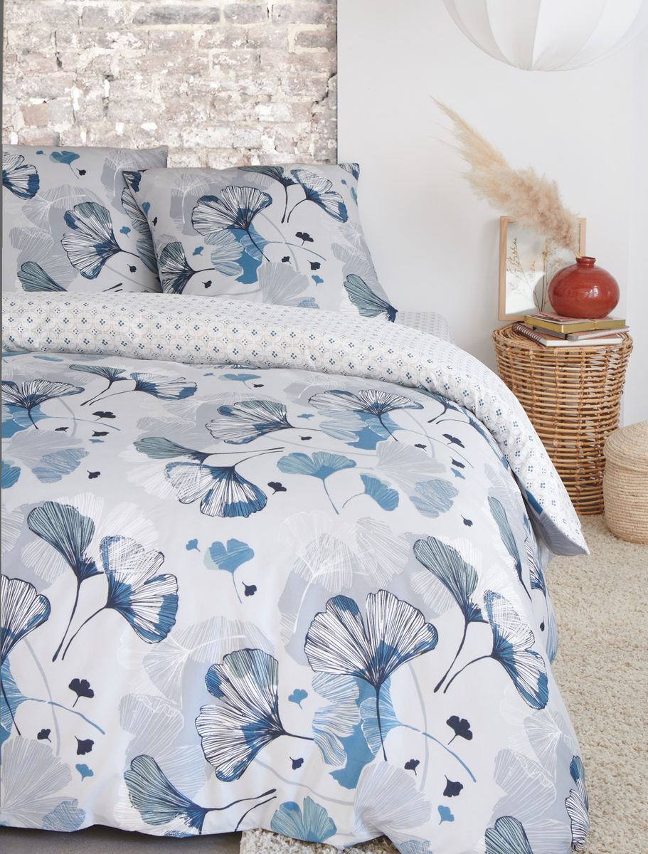 Parure housse de couette 1 ou 2 personne(s) + taie(s) d'oreiller en microfibre. Côté look, un superbe motif "ginkgo biloba" dans une harmonie en bleu et gris aussi reposante que séduisante. Côté matière, une microfibre légère, ultra douce au toucher et très confortable car respirante... un vrai bonheur ! Côté entretien, un séchage ultra-rapide et pas de repassage... un linge de lit de rêve ! Housse de couette à base droite.