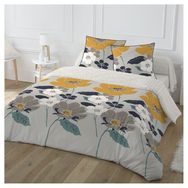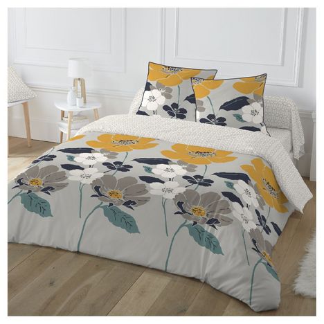 Parure housse de couette 1 ou 2 personne(s) + taie(s) d'oreiller en toile polyester/coton. Des fleurs géantes, graphiques et poétiques à la fois. Une harmonie de couleurs aussi raffinée qu'actuelle... un linge de lit qui fait rimer charme et élégance. On adore ! Côté matière, une toile douce au toucher qui sèche vite et ne demande qu'un léger repassage... une parure à s'offrir les yeux fermés ! Housse de couette à base droite.