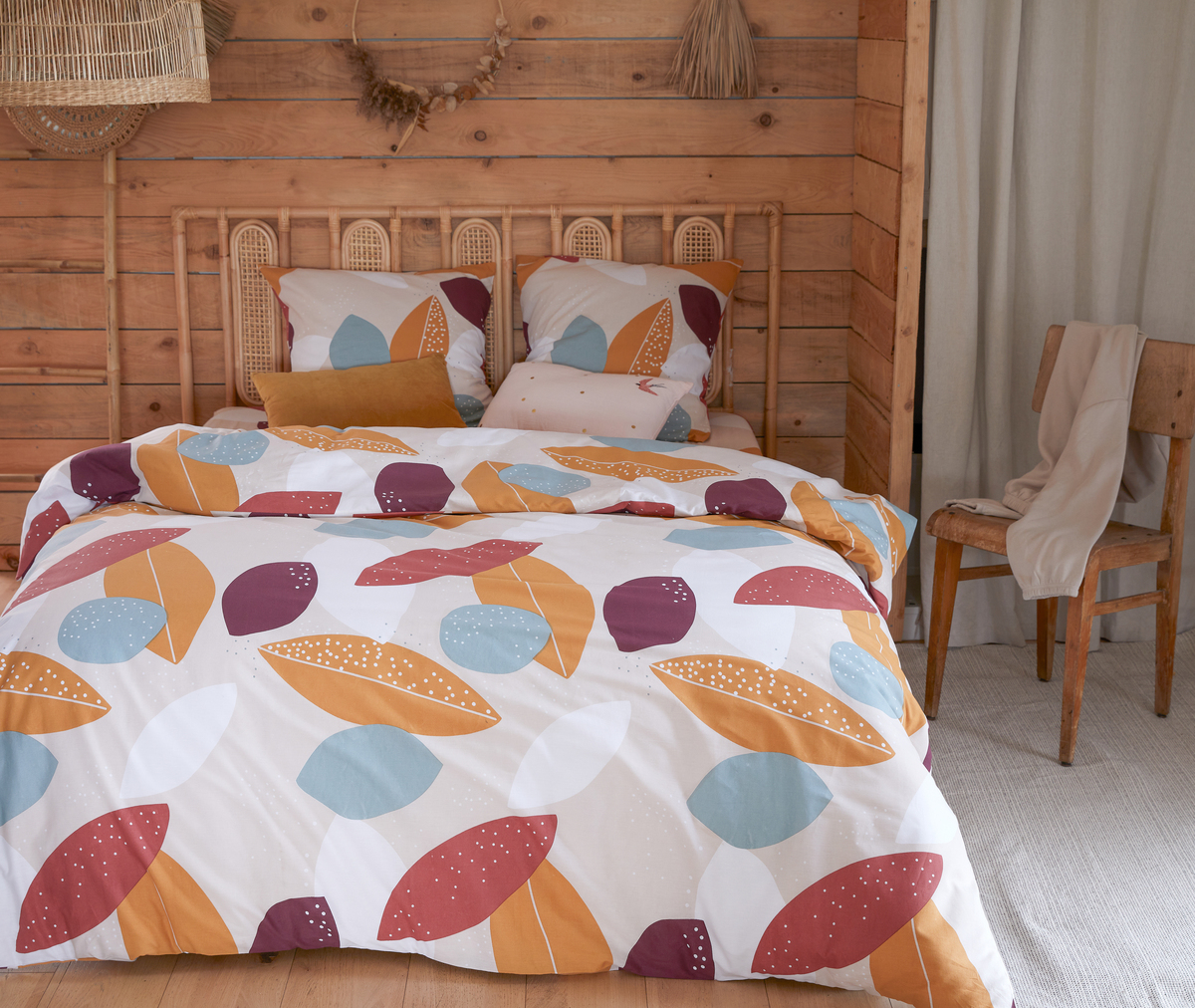 Parure housse de couette 1 ou 2 personne(s) + taie(s) d'oreiller en toile polyester/coton. Un superbe motif "feuillages" stylisé, des tons d'automne dans une harmonie ultra-séduisante, et le drap-housse en CADEAU pour que le plaisir soit complet ! Côté matière, une toile douce au toucher qui sèche vite et ne demande qu'un léger repassage. Un linge de lit qui a tout bon ! Housse de couette à base droite.