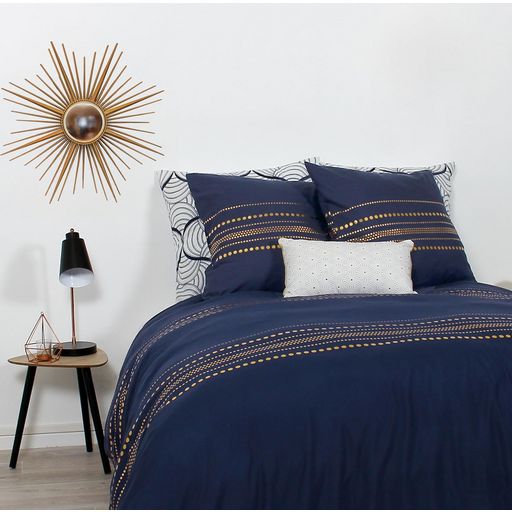 Parure housse de couette + taies d'oreiller en microfibre. D'abord on craque pour ce bleu nuit sublime, magnifiquement rehaussé de pastilles dorées... un vrai coup d'éclat dans la chambre. Et puis nuit après nuit, on savoure la douceur, la légèreté et le confort incomparables d'un linge de lit en mi