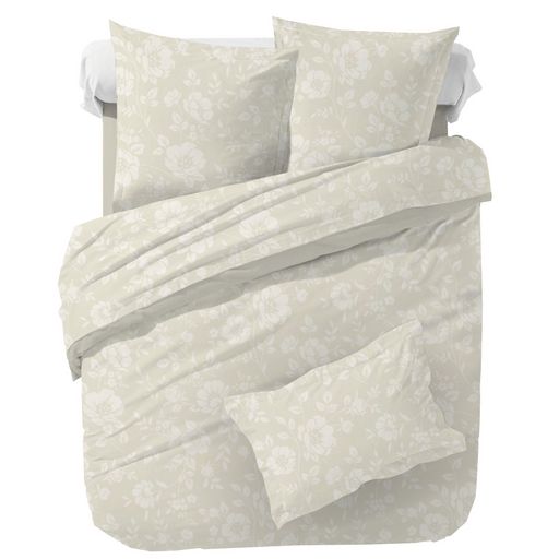 Parure housse de couette + taies d'oreiller en percale pur coton 70 fils. Infiniment souple, doux et soyeux au toucher, la percale coton est une étoffe de grande qualité réalisée avec des fils très fins tissés très serré... un bonheur pour la peau. Associé à un ravissant motif jacquard fleuri aux to