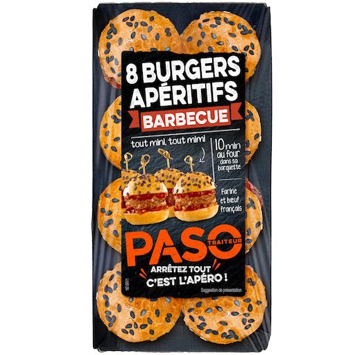 Fans d'apéro, de burgers et de barbecue ? Nous aussi ! Laissez-vous tenter par nos Burgers Apéritifs Barbecue, parfaits pour l'apéro : de délicieux petits buns briochés fabriqués dans notre atelier boulanger, un haché de boeuf et une sauce barbecue avec un émincé de cornichons. Farine de blé et boeuf origine France. Fabriqué en Vendée. PASO, Arrêtez tout, c'est l'Apéro !