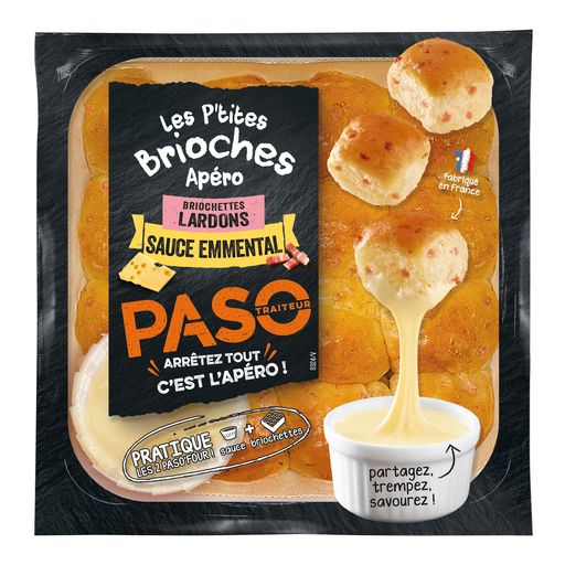 Découvrez nos délicieuses et moelleuses petites brioches aux lardons et leur sauce onctueuse à l’emmental. Parfait pour un apéritif gourmand, il ne vous reste qu’à prendre une briochette, la tremper dans la sauce et la savourer ! Pratique, la sauce et les briochettes passent au four dans la barquette (6 à 8min à 180°C). Fabriqué en France avec de la farine française.