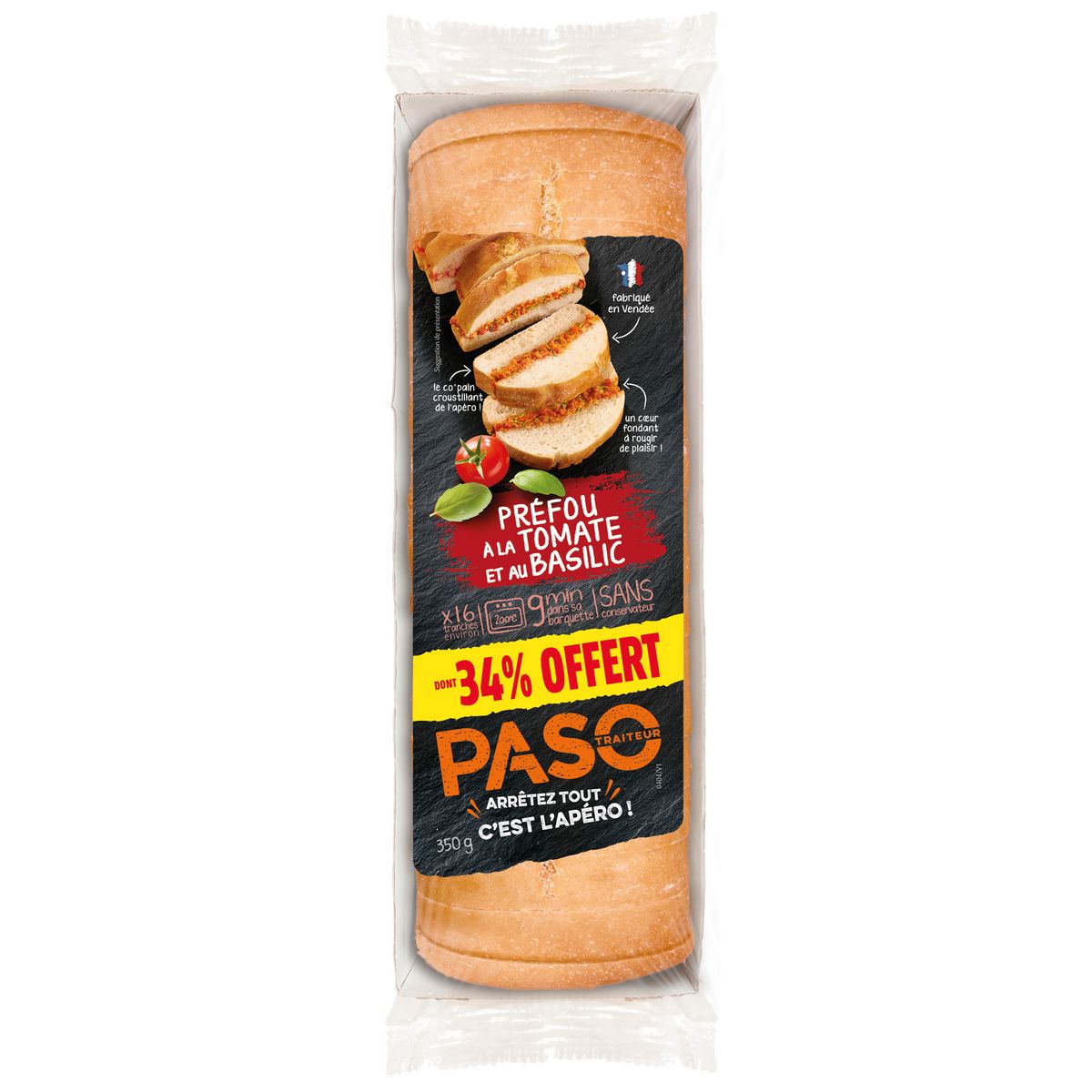 Un délicieux pain généreusement garni de tomate et de basilic et inspiré du savoir-faire traditionnel des boulangers Vendéens. Avec ses 16 tranches, il est idéal à partager entre amis ou en famille à l'apéro. Pratique, il se réchauffe en 9 minutes au four (200°C) et directement dans sa barquette carton. Farine de Blé Français, Sans Conservateur, Fabriqué en Vendée. PASO, Arrêtez tout, c'est l'Apéro !