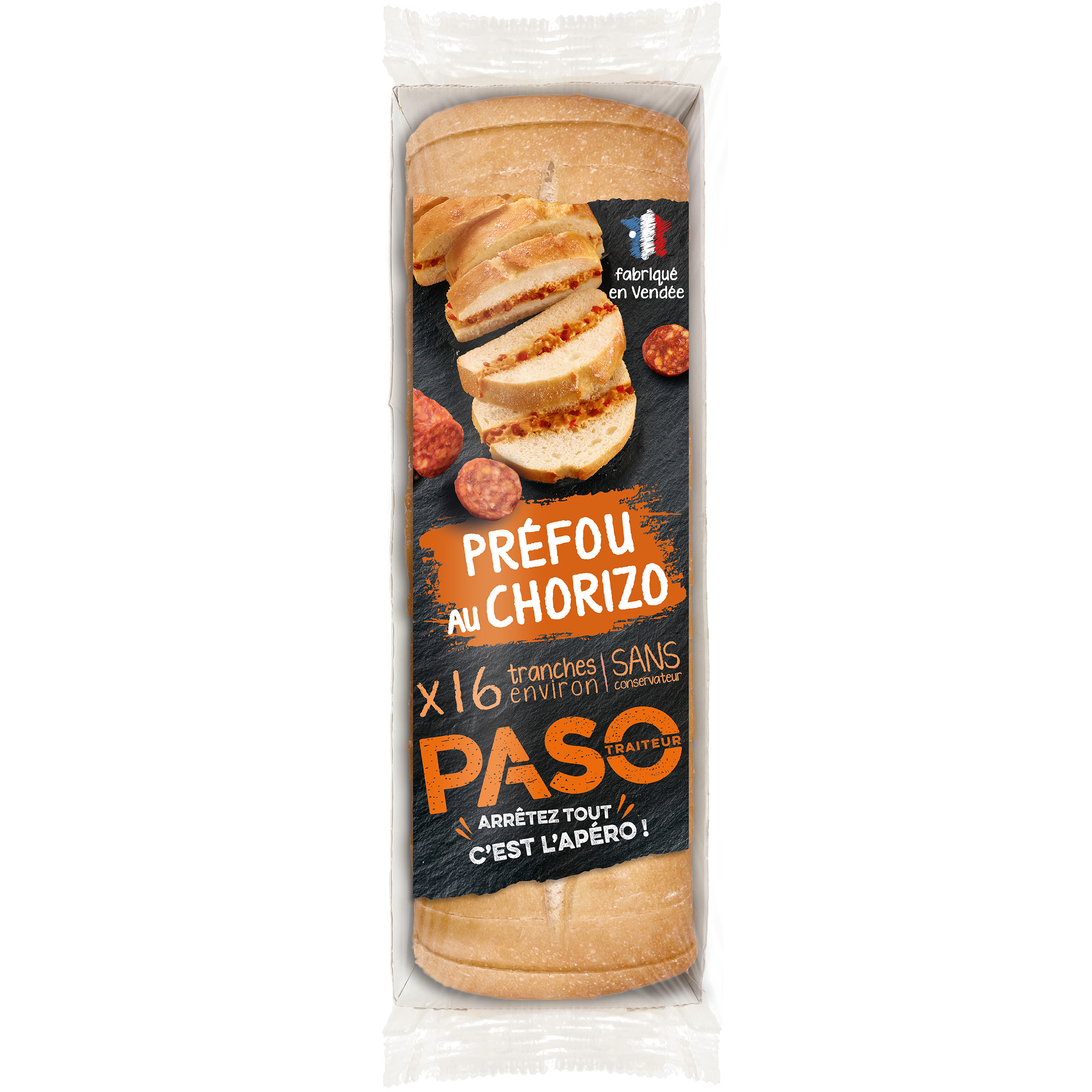 Un délicieux pain généreusement garni de chorizo et inspiré du savoir-faire traditionnel des boulangers Vendéens. Avec ses 16 tranches, il est idéal à partager entre amis ou en famille à l'apéro et pour réchauffer l'ambiance à l'apéro ! Pratique, il se réchauffe en moins de 8 minutes au four (200°C) et directement dans sa barquette carton. Farine de Blé Français, Sans Conservateur, Fabriqué en Vendée PASO, Arrêtez tout, c'est l'Apéro !