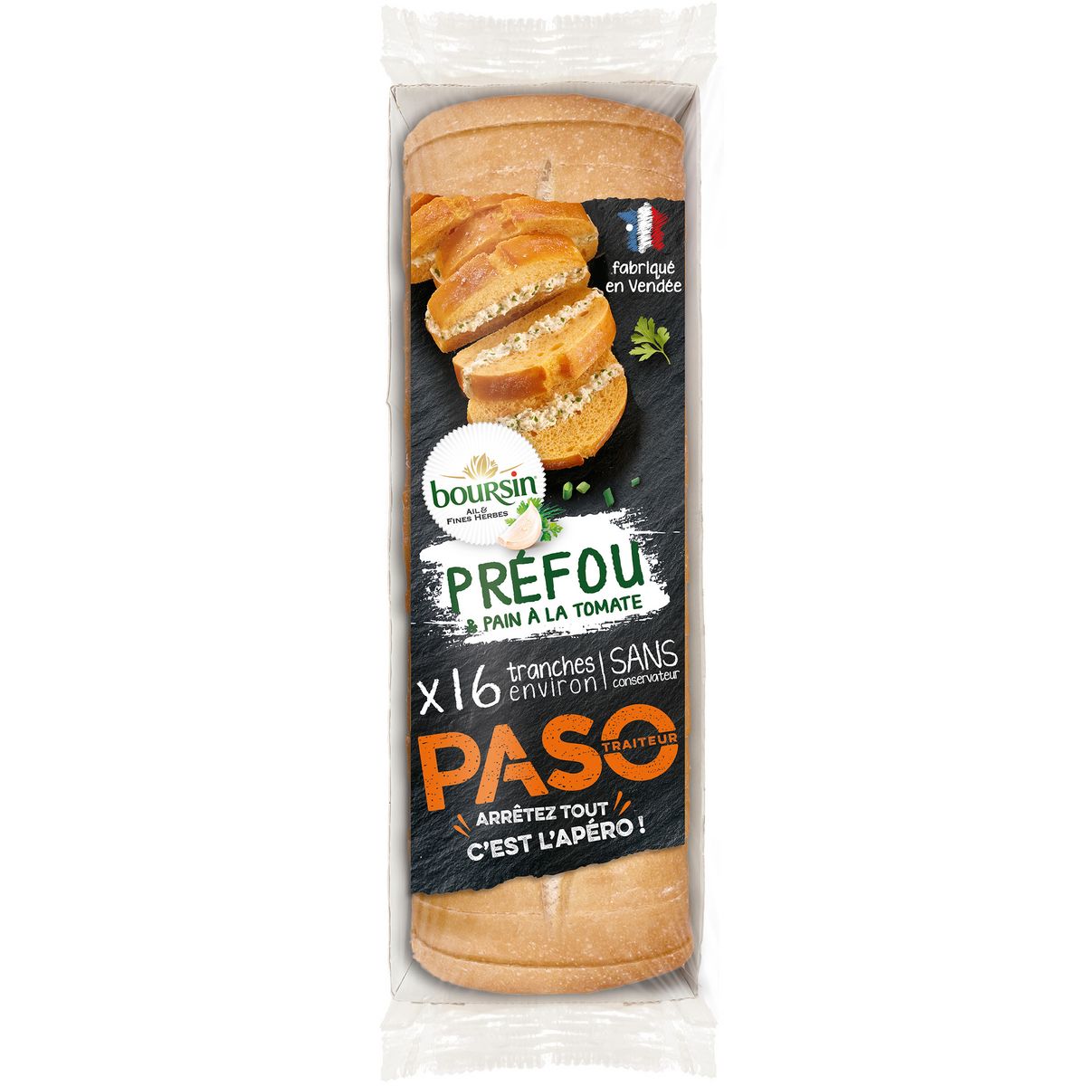 PAIN PRECUIT TRANCHE A LA TOMATE GARNI D'UNE PREPARATION A BASE DE FROMAGE BOURSIN AIL ET FINE HERBES ET DE BEURRE DECONGELE