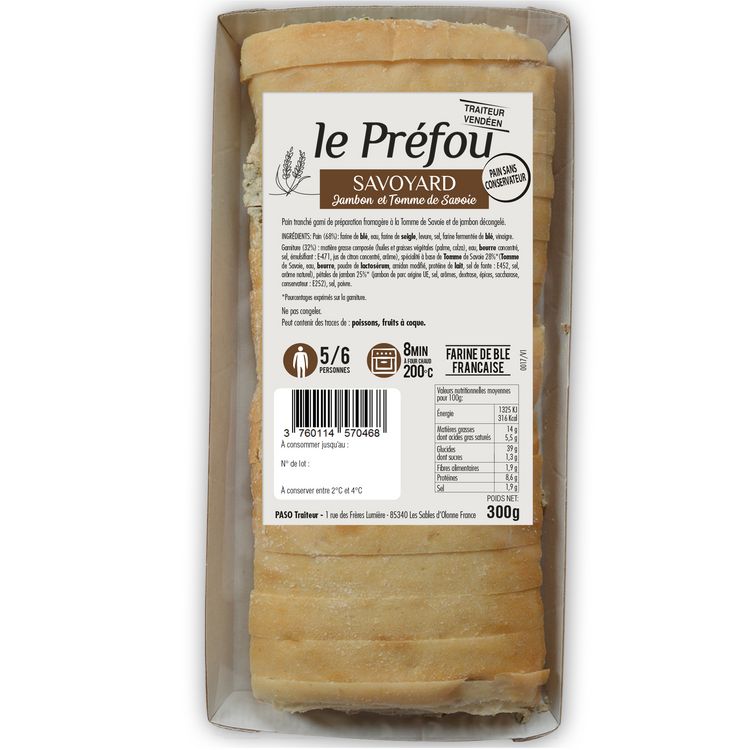 Pain précuit tranché garni de préparation fromagère à la tomme de Savoie et de jambon, décongelé