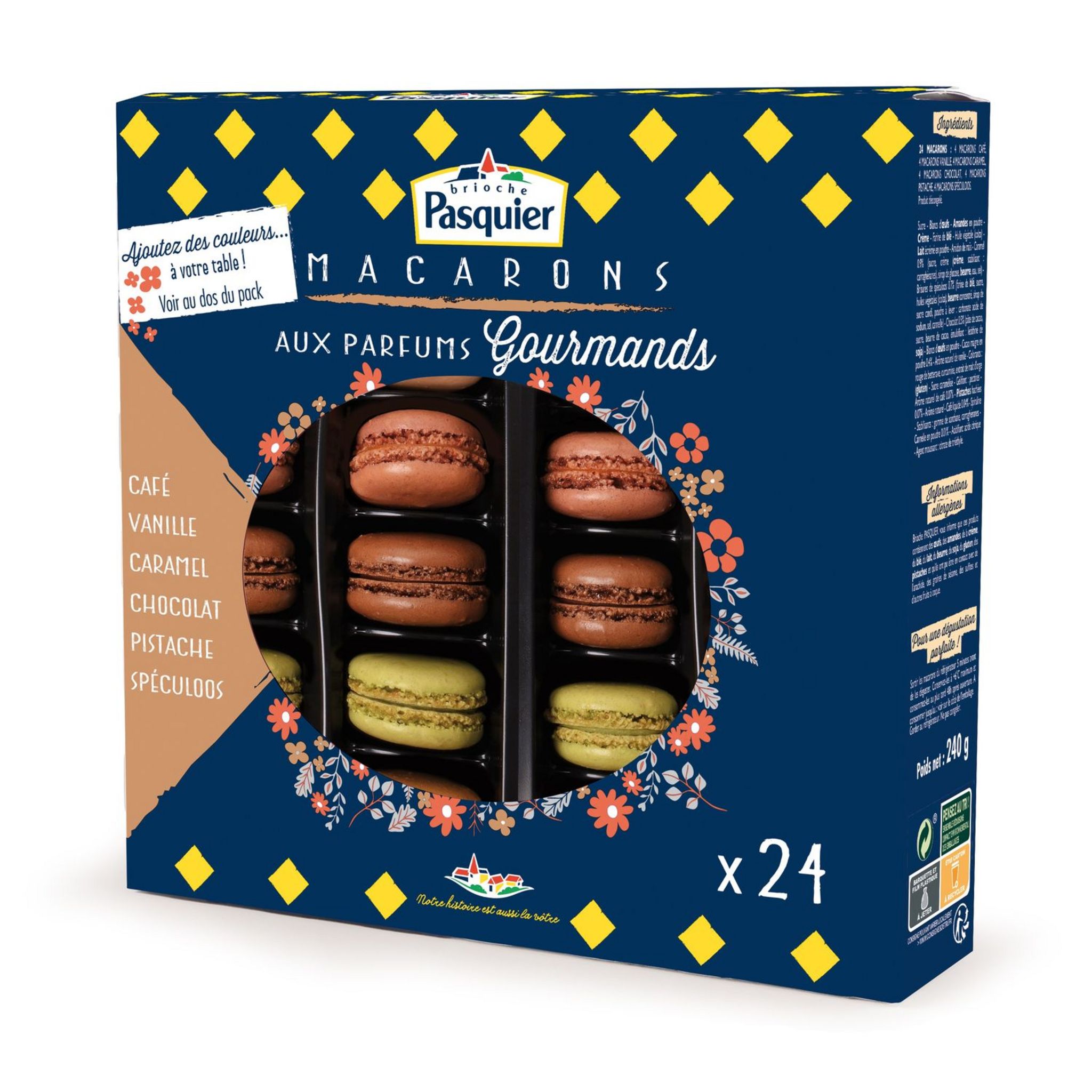 Ingrédients : Produit décongelé INGREDIENTS : Sucre - Blancs d'OEUFS - AMANDES en poudre - CREME - Farine de BLE - Huile végétale (colza) - LAIT écrémé en poudre - Amidon de maïs - Caramel 0.9% (sucre, crème (CREME, stabilisant : carraghénanes), sirop de glucose, BEURRE, eau, sel) - Brisures de spéculoos 0.7% (farine de BLE, sucre, huiles végétales (colza), BEURRE concentré, sirop de sucre candi, poudre à lever : carbonate acide de sodium, sel, cannelle) - Chocolat 0.5% (pâte de cacao, sucre, beurre de cacao, émulsifiant : lécithine de SOJA) - Blancs d'OEUFS en poudre - Cacao maigre en poudre 0.4% - Arôme naturel de vanille - Colorants : rouge de betterave, curcumine, Extrait de malt d'orge(GLUTEN) - Sucre caramélisé - Gélifiant : pectines - Arôme naturel de café 0.07% - PISTACHES hachées 0.07% - Arôme naturel - Café liquide 0.04% - Spiruline - Stabilisants : gomme de xanthane, carraghénanes - Cannelle en poudre 0.01% - Acidifiant: acide citrique - Agent moussant : citrate de triéthyle. Brioche PASQUIER vous informe que ce produit Contient des OEUFS, des AMANDES, de la CREME, du BLE, du LAIT, du BEURRE, du SOJA, du GLUTEN, des PISTACHES et qu'il a pu être en contact avec de l'arachide, des graines de sésame, des SULFITES et d'autres fruits à coque.
