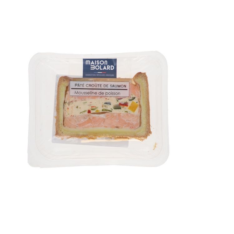 TR PATE CROUTE SAUMON ATLANTIQUE FARCI A LA MOUSSELINE DE POISSON ET LEGUMES 100G,CONDITIONNE SOUS ATMOSPHERE PROTECTRICE