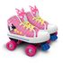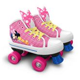 Patins à roulette 4 roues. Chassis PP haute résistance. Frein avant. Roulement 608Z. Roues PVC. Chaussures semi-montante en toile. Languette 3D rembourrée en mousse à l'effigie du Nœud de Minnie.