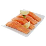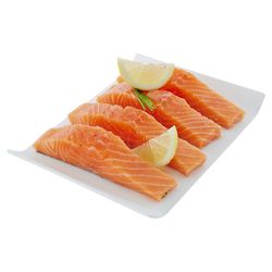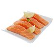Barquette de filets de saumon. Garanti sans arêtes (contient moins d'une arête au kilogramme, d'une longueur égale ou supérieure à 10 mm ou d'un diamètre égal ou supérieur à 1mm ; une arête d'une longueur égale ou inférieure à 5mm n'est pas considérée comme un défaut si son diamètre ne dépasse pas 2mm).