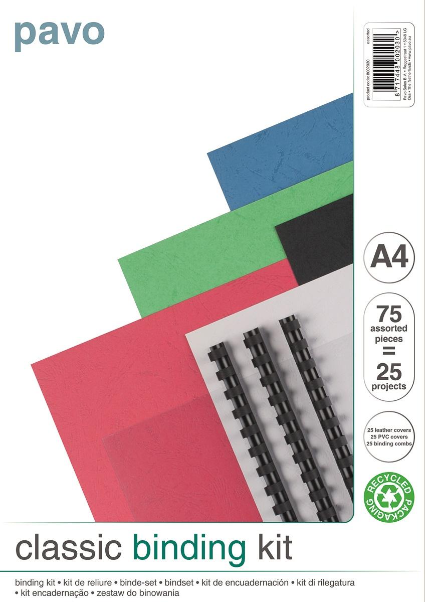 Kit de reliure assortie pour 25 dossiers ( 25 peignes, 25 couvertures transparente, 25 plats de couleurs ). Format A4.