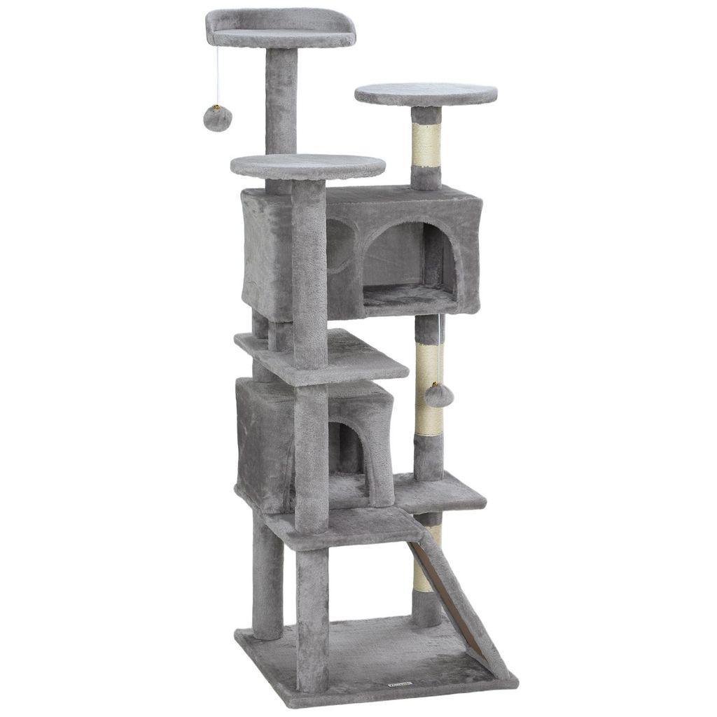 Arbre à chat 2 niches grattoir griffoirs plate-formes 2 niches 2 jouets pompons peluche grise
